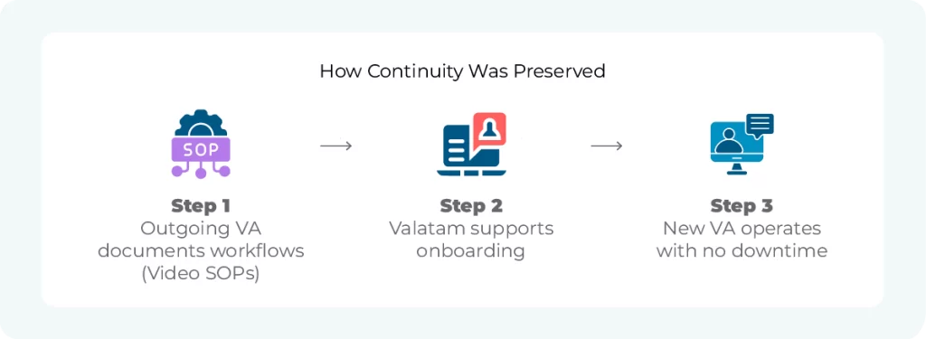 When the first VA eventually transitioned off the project, she proactively documented her workflows with video SOPs. This allowed the replacement VA to onboard quickly and maintain performance levels from day one.