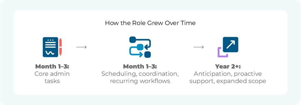 As trust developed, responsibilities expanded. Scheduling, coordination, and recurring administrative work were gradually delegated, reducing Jonathan’s day-to-day workload.